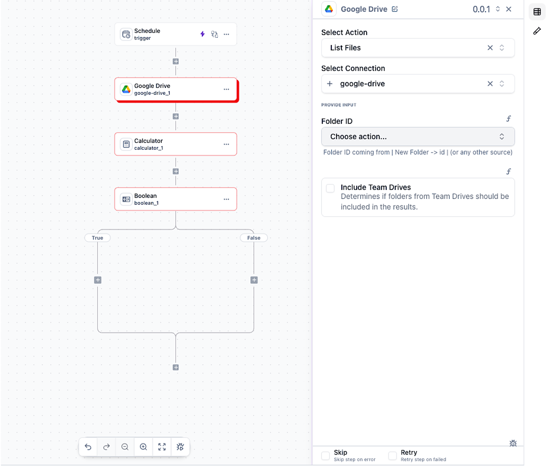 Browse and connect to hundreds of apps and services. Click the ”+” button on the canvas to open the integrations browser.